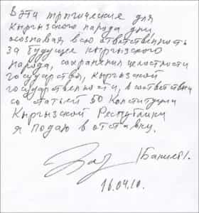 7 Апреля 2010 года в Кыргызской Республике произошел государственный переворот. В результате вооруженного захвата государственной власти пролилась кровь простых ни в чём неповинных граждан, нанесен огромный урон имиджу государства. Вся ответственность лежит на членах Временного Правительства, которые использовали их для захвата власти. Понимая и свою ответственность за прошедшие события, приношу глубокие соболезнования всем родным и близким погибших. В эти трагические для кыргызского народа дни, осознавая всю ответственность за будущее кыргызского народа, сохранения целостности государства, кыргызской государственности, в соответствии со статьей 50 Конституции Кыргызской Республики, я подаю в отставку.