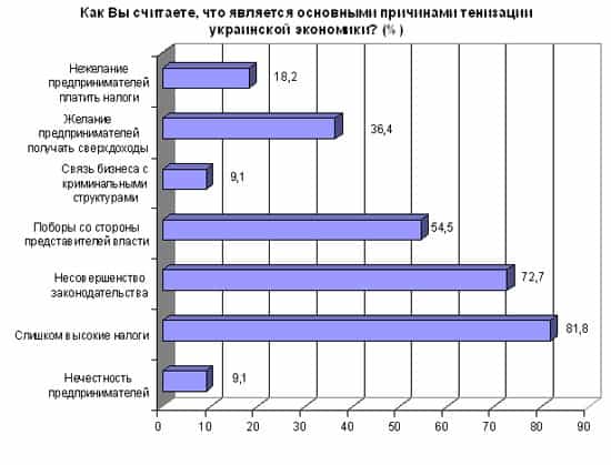 В целом, выделяются две составляющие теневой экономики. Первая — это формально законный «уход в тень» на основе использования различных лазеек и неточностей в правовых актах. Наибольшей популярностью в Украине пользуется так называемая «оптимизация налогов», когда предприниматели, открыто не нарушая законов, искусственно увеличивают расходы, прикрываются благотворительной деятельностью, обналичивают средства в специальных конвертационных центрах, используют услуги «фирм-однодневок». Обычно для объяснения этой ситуации применяют правило «чем выше налоговое бремя, тем больше теневой сектор экономики». Но на самом деле в Украине уровень налогообложения намного меньше, чем в таких социально-ориентированных экономиках Запада, как Швеция, Дания, Норвегия или Франция. И дело тут совсем не в том, что там хотят платить налоги, а у нас это считают зазорным. Желание платить налоги само по себе анормально. Различие в том, что в развитых странах понимают: уплата налогов является необходимостью, поскольку они формируют доходную часть бюджета, из которой оплачиваются социальные программы. Поведение же украинских предпринимателей обусловлено, в первую очередь, историческим фактором, ведь на постсоветском пространстве неумение воровать у государства воспринимается как отсталость в развитии. Между прочим, около 73% предприятий, в которых ГлавКРУ выявляет финансовые нарушения, являются государственными. Однако в нынешних условиях все большее значение принимает другая причина — громоздкая система налогов и их непрозрачность. В Украине, по данным Всемирного банка, полученных в рамках проекта Doing Business, компании среднего размера приходится платить 99 различных платежей и налогов, причем по простоте их уплаты ниже нас в рейтинге находится только Беларусь. К примеру, в Великобритании таких налогов всего 8, в США — 10, Франции — 11, Турции и Италии — 15, Германии — 16. Более того, по данным того же Всемирного банка, в соседней России предприниматели обязаны вносить лишь 22 платежа.