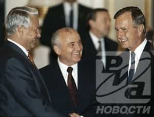М.С.Горбачев. Я жму Вашу руку Джордж, и передаю привет вашим коллегам. От меня и Раисы Максимовны — большой привет Барбаре.