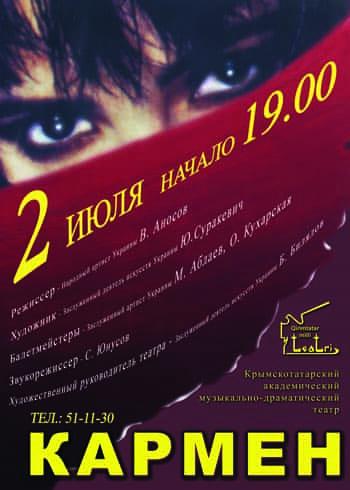 Крымскотатарский академический музыкально-драматический театр приглашает на спектакль «КАРМЕН», который состоится 2 июля в 19:00. Билеты можно приобрести в кассе театра по адресу г. Симферополь, ул. Менделеева 5. Справки по тел. 8 (0652) 51 — 11 — 30.