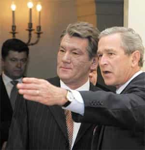 В начале 2001 года в должность президента США вступил Буш-младший. Период его правления отмечен резкой активизацией украинского направления во внешней политике США, пик которой пришелся на 2004 год, когда США открыто, без всякой оглядки, вмешивались во внутренние дела Украины и оказывали прямое давление на украинское руководство. Так, в июле 2004 года Палата представителей приняла резолюцию, в которой исполнительной власти США предписывалось ввести против Украины санкции, если будут обнаружены нарушения во время президентских выборов. В сентябре 2004 года на подобный шаг пошел Сенат. Санкции предполагали введение запрета на въезд в США высших должностных лиц Украины, прекращение деятельности, связанной с предоставлением кредитов и финансовой помощи.