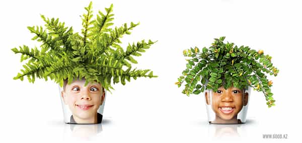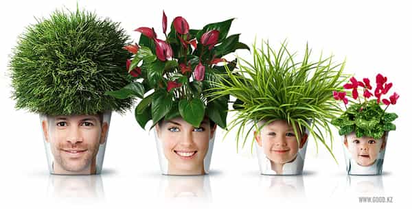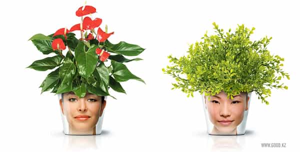 «Графический прием: продолжаем эксперименты в области синтеза изображений и объектов. Мы не претендуем на новизну идеи (существуют рекламные кампании основанные на эффекте объединения растения и человеческого лица), но нам хотелось воплотить данный прием в виде конкретного объекта. Фишка которая нам понравилась в том, что цветочный горшок и лицо человека имеют сходную форму, что способствует их зрительному объединению, а если еще и форма кроны растения позволяет скрыть верхнюю кромку горшка, эффект становится полный и довольно забавный».