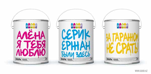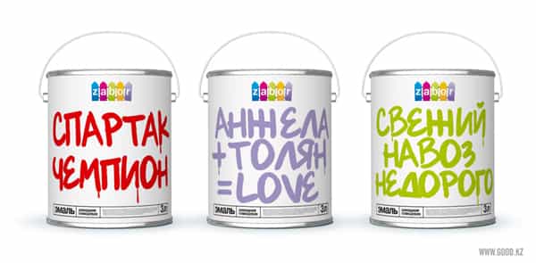 «Графический прием: в процессе работы над одним проектом родилась идея, которую мы решили визуализировать. Название торговой марки «Zabor» говорит о том, что это краска лоу-сегмента, т.е. недорогая — то, что надо для покраски вашего забора. В качестве маркера цвета краски, которая находится в банке, использованы надписи, которые мы подсмотрели на стенах и заборах наших городов. За каждой такой фразой стоят определенные эмоции, иногда негативные, но….когда мы вырвали их из контекста (конкретного дома или подъезда) и поместили на банки, они вызывают только улыбку».