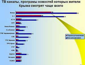 Если верить авторам исследования, то получается, что в Крыму российское ТВ уже не столь популярно как в прошлые годы. Во всяком случае, жители полуострова называли гораздо чаще украинские телеканалы, отвечая на вопрос, по какой программе смотрят выпуски новостей: «Интер» назвали 36%, «1+1» 26%, ICTV 5%, а российское ОРТ — лишь 4%.